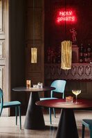 Marc Sadler explores the infinite possibilities of Slamp’s technopolymers with Accordèon, conjuring the image of a textile plissé or an accordion’s bellows. The collection is a sure marker of the new contemporary narrative that sees design, fashion, artisan technique and technology in permanent interaction. The vertical suspension version has a 30 cm cylindrical shade available in either transparent or gold, connected to the ceiling with a black-wrapped cable and a glossy ceiling rose. Multiple suspensions make for an elegant, dramatic installation fit for hotel reception areas, bars, and other locations.