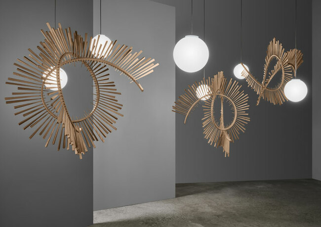 Aimei is the most sculptural pendant lamp by Arturo Álvarez. Inspired by the spine of the atavistic and ancestral universe, it breathes from its ribs, opening, closing, beating strongly. In its protected interior, the heart of the universe peeks out, where the primordial light and life are hidden.