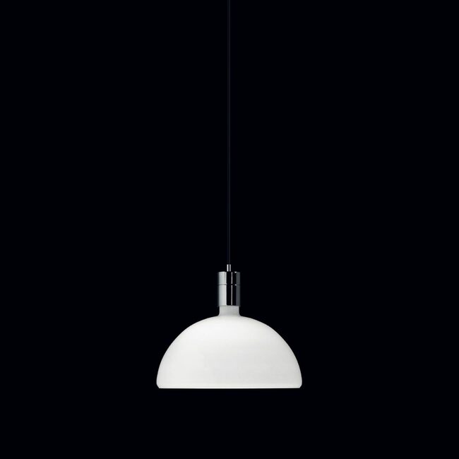 Pendant lamps with chromed metal parts at sight. Cupshaped diffuser, in opal white glass. Flood beam distribution.