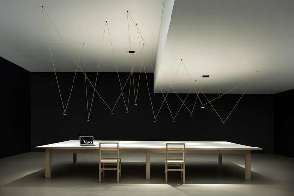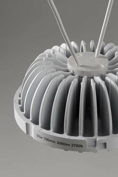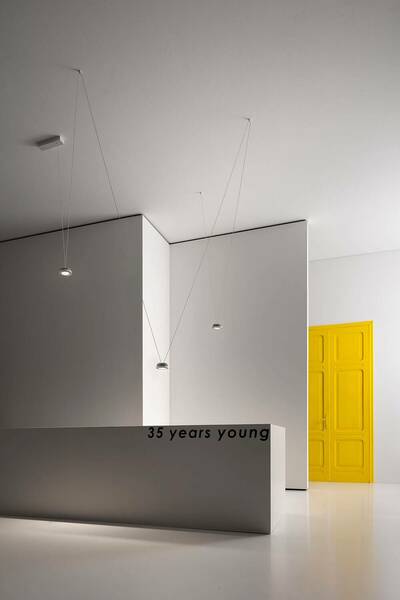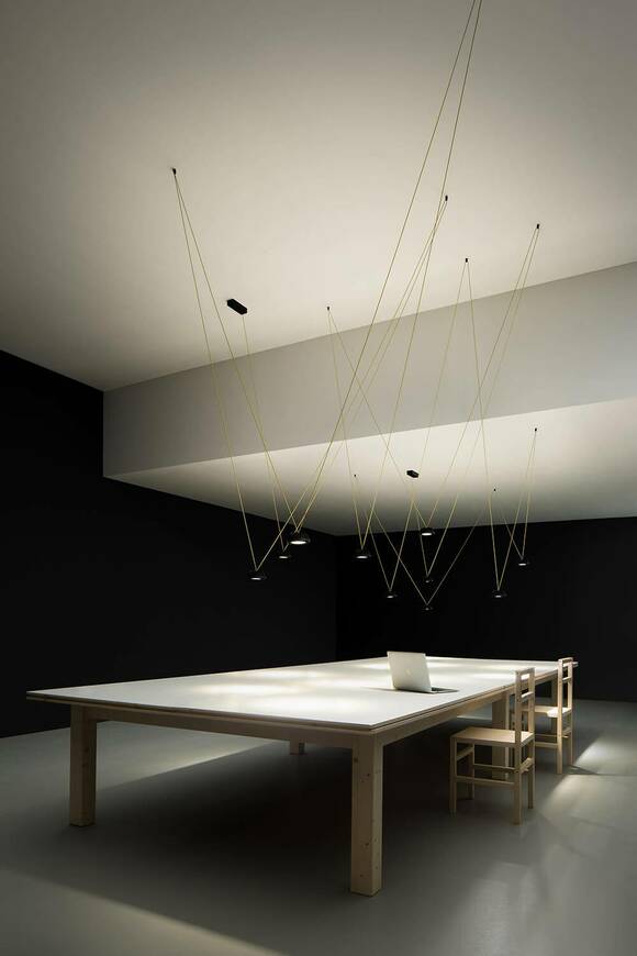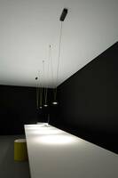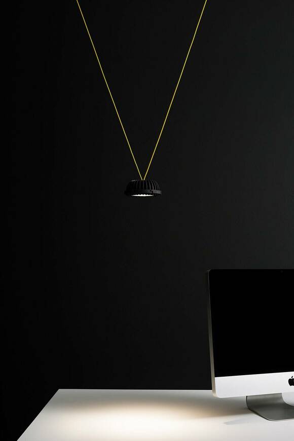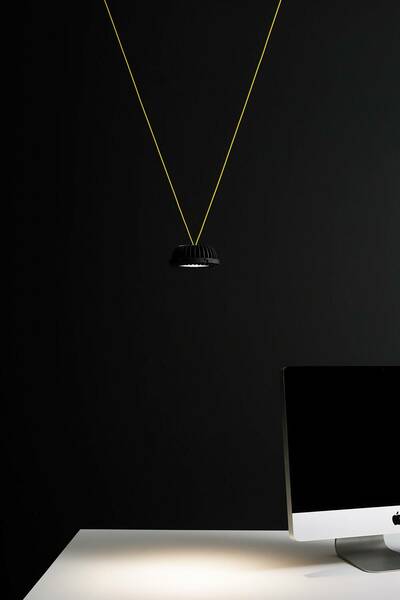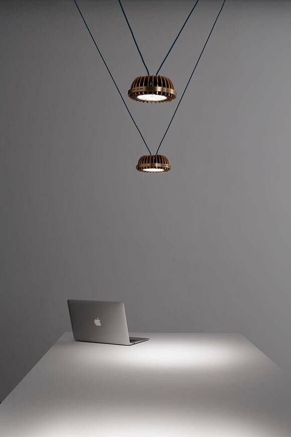 a suspension lamp with an unusual aesthetic, which aims to make lighting barycentric and transform the concept of technical light into identity. the source at the center of the project with a contemporary, visible and innovative expressive language, which is not hidden and which does not accept compromises. a reference to hi-tech that integrates with strength and elegance in the spaces that welcome it. being, conjugated to appearing.