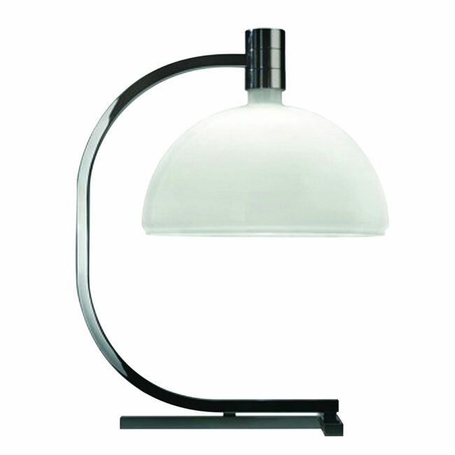 Table lamp with structure in chromed or black chromed metal. Cupshaped diffuser, in opal white glass. Flood beam distribution, dimmer on the cable.