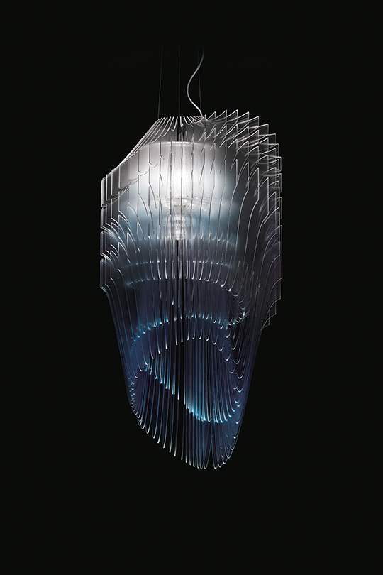 Zaha Hadid’s visionary, fluid, and dynamic luminous architectural objects bring the designer’s revolutionary and iconic semantics to any domestic or public space, inspiring harmony between beings and atmospheres. Avia brings the grandeur of large-scale buildings to a quotidian lamp, integrating technical, voluminous forms with innovative lighting technology. Fifty diverse, Cristalflex® layers surround the central light source in perfect construction, transforming light into sculpture.