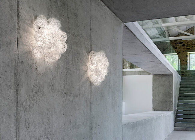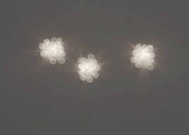 Arturo Álvarez introduces steel thread into his repertoire of materials with the design of this collection. Wrapping it around itself, he creates spheres that he later joins into ethereal, almost transparent volumes, giving this wall lamp a subtle beauty. Its white finish accentuates the delicacy of a piece generated by hand from a material as cold as steel, which now seems to bloom full of life.