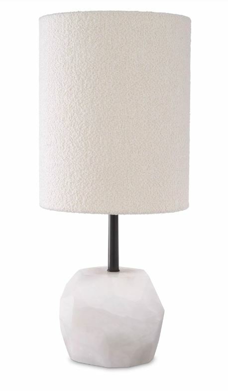 Table Lamp Cahaba is an ideal lamp for dressers, side tables and nightstands. This handsome lamp has a geometric base that is cut out from a solid piece of alabaster and a bronze finish fixture. It is supplied with a bouclé drumshade.