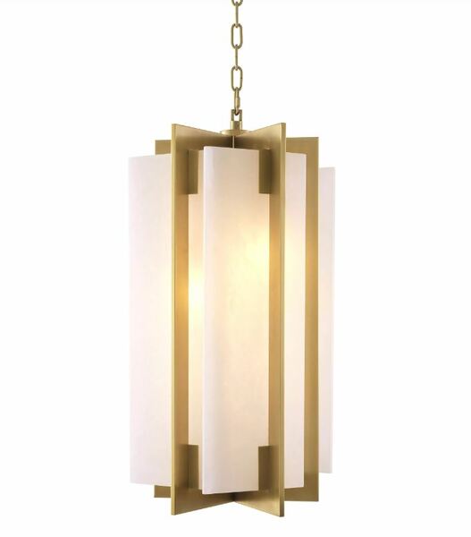 Chandelier Lugano is a truly unique piece. This 5-light hanging pendant comes in an antique brass finish and features stylish geometric shades with inserts of translucent alabaster. Each lamp hangs on an antique brass chain that is adjustable in height.