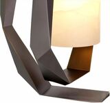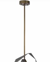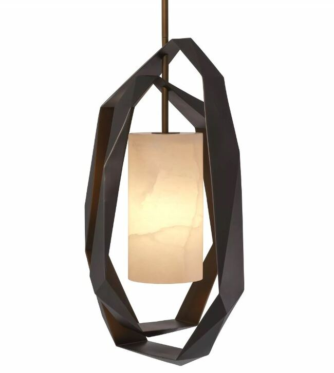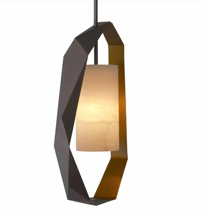 The cut out shapes of Chandelier Santos create a modern silhouette that is suitable for any bedroom, living room, dining area, or even hallway. The outside of the metal is beautified with a gunmetal finish. The inside has an antique brass finish that gets a nice glow when the chandelier is lit. The tubular lampshade is made from translucent alabaster.