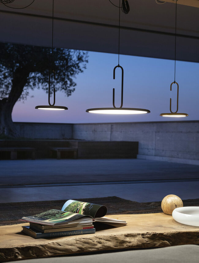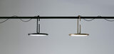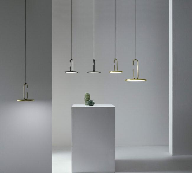 Clip is a collection of suspension lamps defined by a thin disc coupled with an open slot hooked to the support cable.