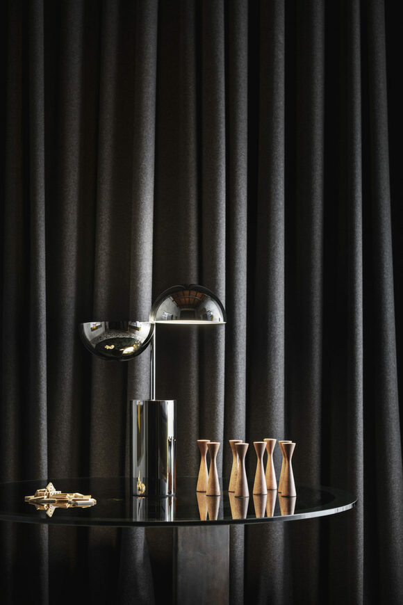 Elisabeth collection is inspired by an astronomical game of hemispheres: from the linear version of the table lamp to the suspension lamp, reminiscent of art deco. The formal cleanliness of the volumes is enriched by glossy metal and Carrara marble.