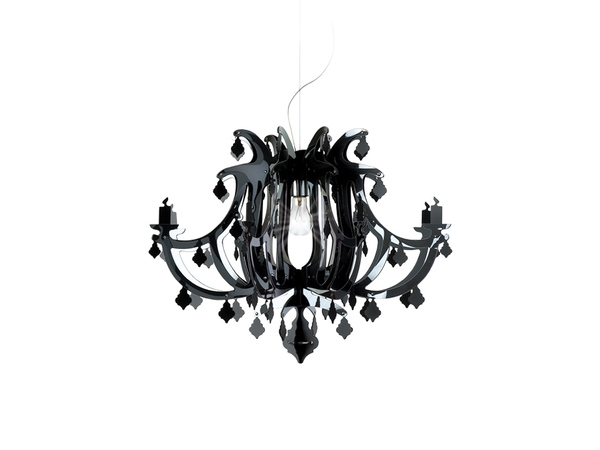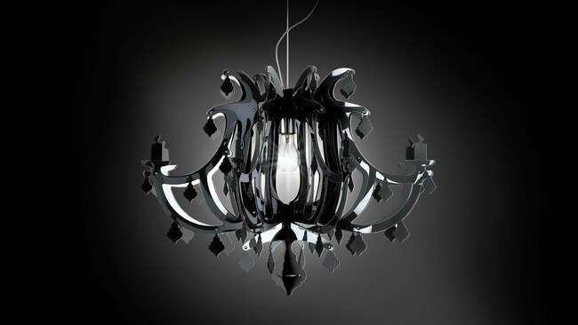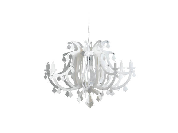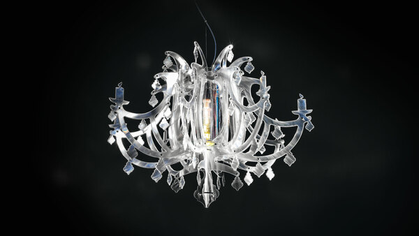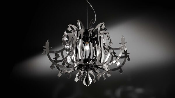 A classic 8-arm chandelier underwent digital evolution; Ginetta’s sumptuous modern shape extends from a central light source that casts elegant, refined reflections, blending into both modern and aristocratic atmospheres. The cylindric diffusor in iridescent polycarbonate is surrounded by the option of three finishes; metal, prisma or Opalflex®.