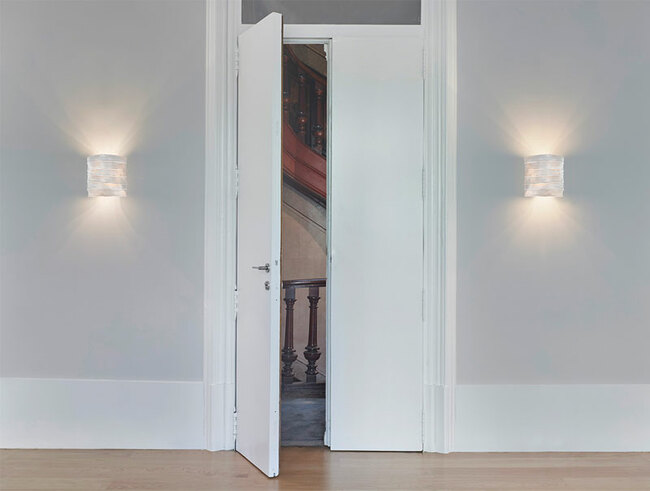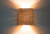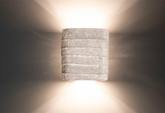 Kala is a delicate wall lamp handmade in painted stainless steel mesh. Its irregular volume, designed by Arturo Álvarez, recalls the changing patterns of the sand in the great dunes, horizontal lines marked by the folds of a material that plays at covering the light, allowing it to reflect indirectly on the wall.