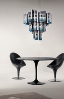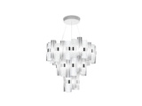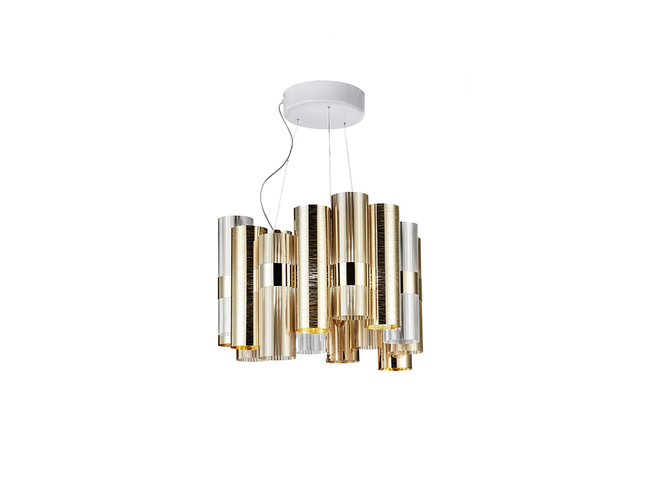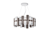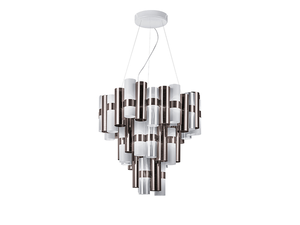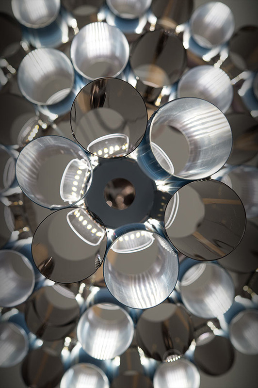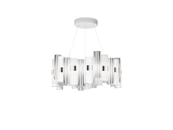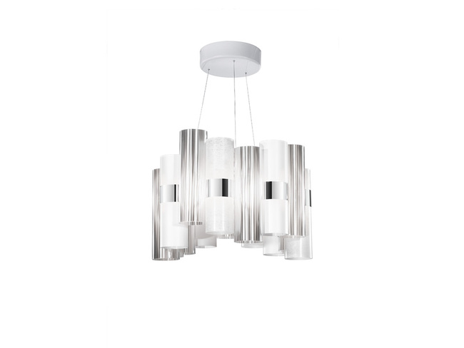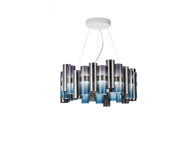 La Lollo is a tribute to the roaring 50’s, a series of graceful suspensions that reawaken images of divas in the spotlight. The techno-polymer cylinders, in varying shades of contemporary prismatic metallization and geometric patterns, alternate around a central, illuminated ring. The collection includes 2 sizes, as well as an opulent chandelier, all designed for public or domestic spaces, or to be combined in dramatic installations.