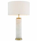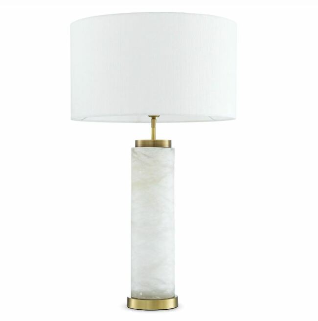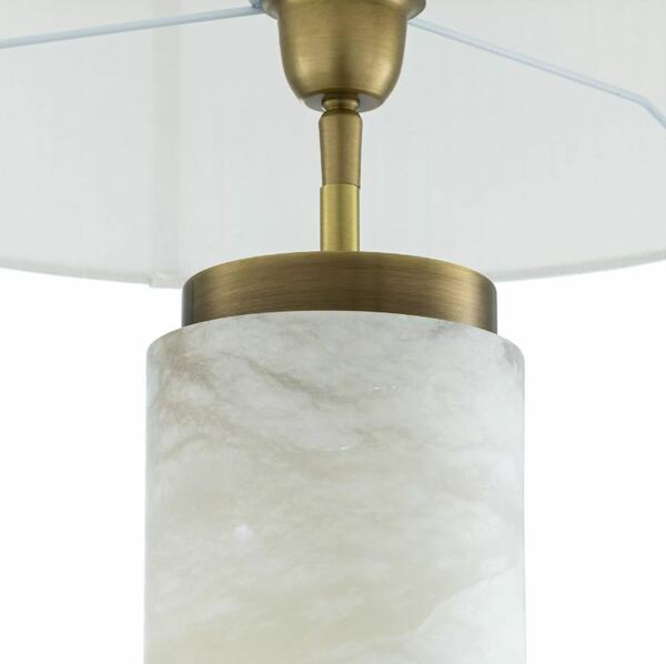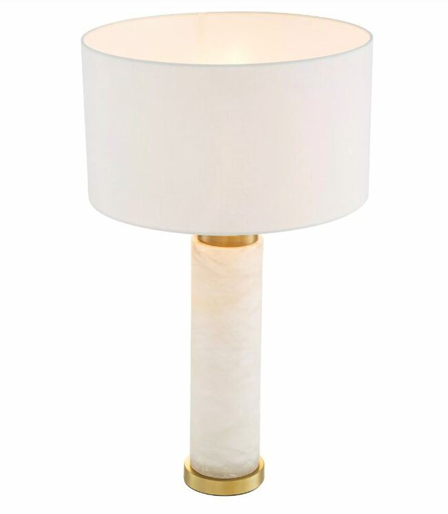 Table Lamp Lxry exudes sophistication. This lovely lamp has a cylindrical body of alabaster and a base and socket with antique brass finish. It is completed with an off-white drum shade to suit all décors. Ideal for hallways, living rooms, dining areas, bedrooms and more.