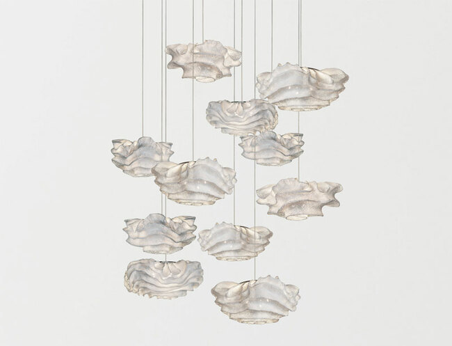 A collection that reflects the extreme malleability of painted stainless steel mesh better than any other. The combination of lamps of all sizes in a composition, presents those unrepeatable organic shapes characteristic of the collection designed by Arturo Alvarez. Its handmade curves make each of the lamps unique and different from all the others. They are volumes that seem to be alive, in constant evolution and movement, both for their shape and for the folds through which the light spreads. This is one of the most extensive collections of the brand, including pendants, table lamps, wall lamps and cascading compositions.