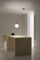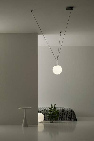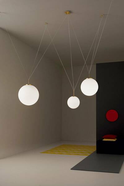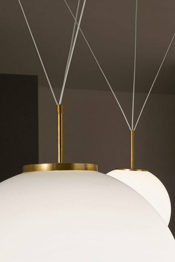 pallatre is a suspension lamp. available in different dimensions 30 cm, 40 cm and 50 cm with opal triplex blown glass diffuser and led lamp included. available in table version and floor version. pallatre is available in the following finishes, all combined with the opal blow glass diffuser: