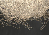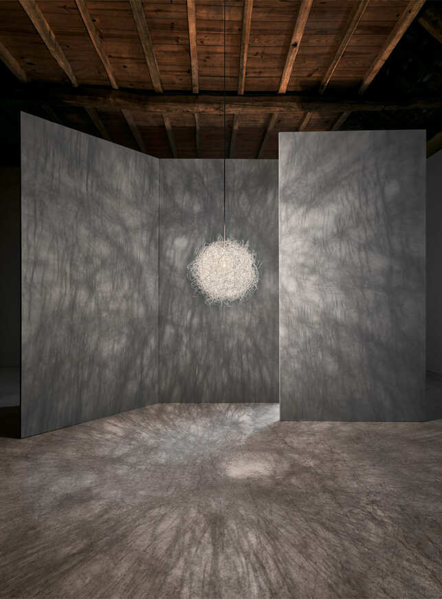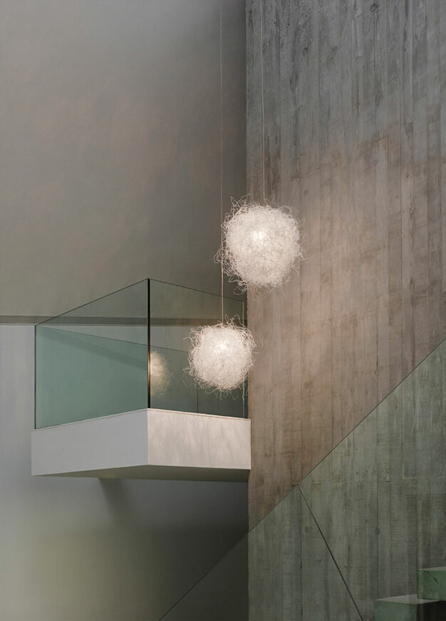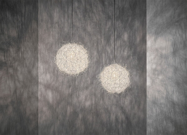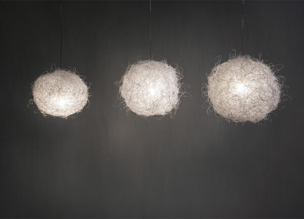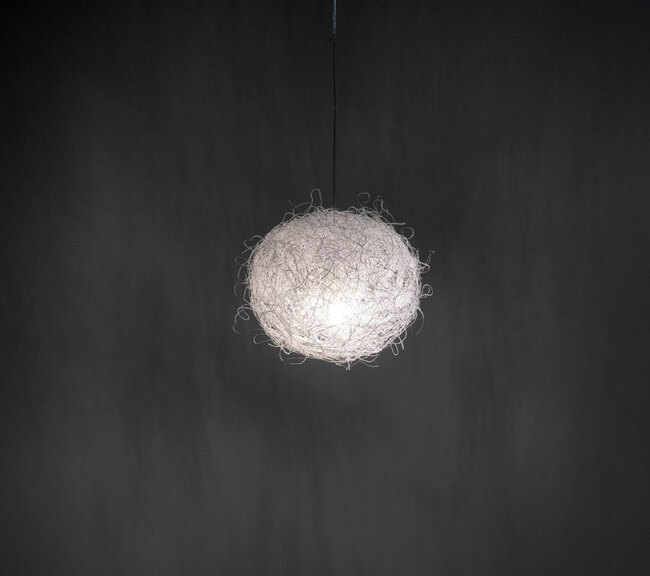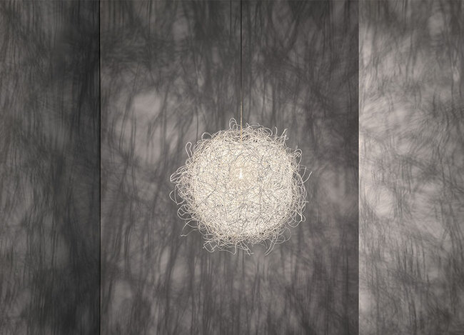 The large Pili pendant lamp is a single painted stainless steel thread of 55 cm diameter that intertwines generating a random volume, weaving a harmonious and enveloping irregularity full of charm and mystery. This skein through which light escapes is handmade in Spain. The collection is presented in 3 lamp sizes that allow you to create compositions of great visual impact.