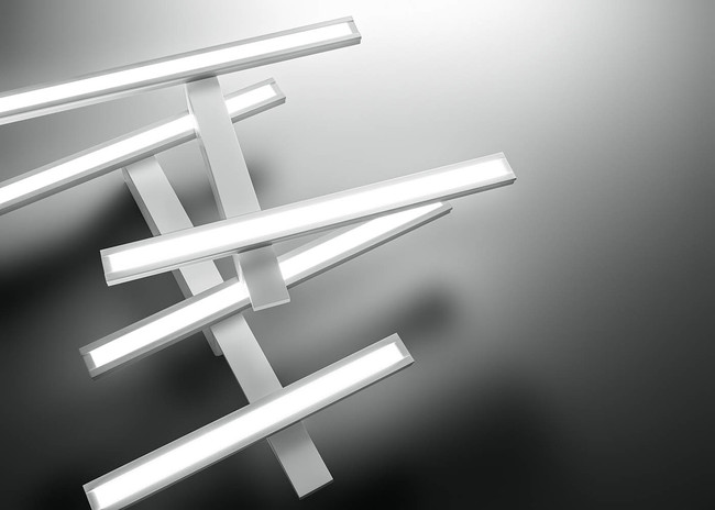 Lamp with aluminium structure and metacrylate diffuser. Available in matt white. LED light source with dimmable ballast included (Push). Direct illumination.