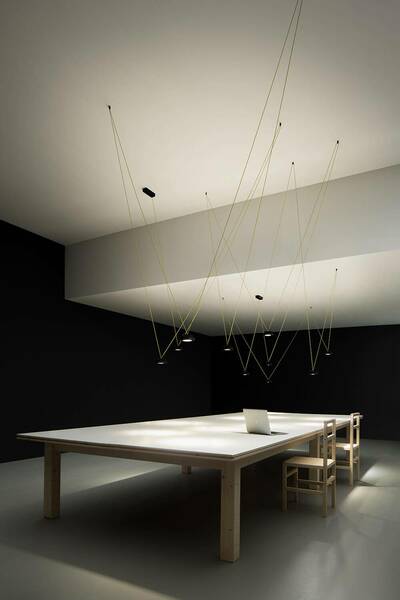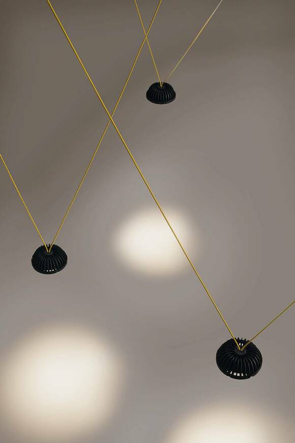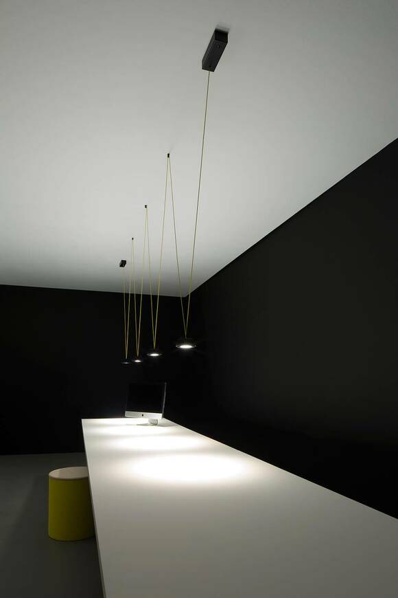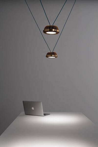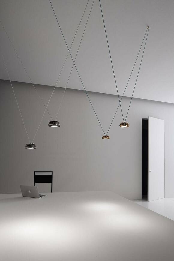 Ένα κρεμαστό φωτιστικό με ασυνήθιστη αισθητική, που στοχεύει να κάνει τον φωτισμό βαρυκεντρικό και να μετατρέψει την έννοια του τεχνικού φωτός σε ταυτότητα. Η πηγή στο κέντρο του έργου με μια σύγχρονη, ορατή και καινοτόμο εκφραστική γλώσσα, που δεν κρύβεται και που δεν δέχεται συμβιβασμούς. Μια αναφορά στην hi-tech που ενσωματώνεται με δύναμη και κομψότητα στους χώρους που την υποδέχονται.