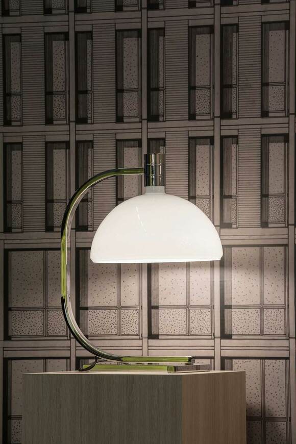 Επιτραπέζιο φωτιστικό από μέταλο, σε χρώμιο ή μαύρο χρώμιο. Στο σχήμα κούπας με οπάλ λευκό γυαλί. Το φως διαχέεται έντονα, έχει ντίμερ στο καλώδιο.