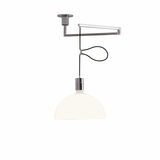 Κρεμαστό φωτιστικό με μεταλλικά μέρη σε χρώμιο. Ανακλαστήρας σε σχήμα κούπας, με λευκό οπάλ γυαλί. Έντονη διάχυση φωτός. Το μπράτσο του φωτιστικού είναι από ατσάλι και μπορείτε να ρυθμίσετε το μήκος του.