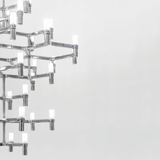 Kρεμαστός πολυέλαιος το σχήμα του οποίου είναι εμπνευσμένο από τον κρύσταλλο χιονιού. Σπονδυλωτές λάμπες με δομή αλουμινίου και γυάλινοι ανακλαστήρες αμμοβολής. Τα χρώματα που κυκλοφορεί είναι: γυαλισμένο αλουμίνιο, επιμεταλωμένο χρυσό ή μαύρο, ματ λευκό, ματ μαύρο ή ματ χρυσό. Το φως του διαχέεται ευρέως. Εφοδιασμένο με διαφανές καλώδιο.