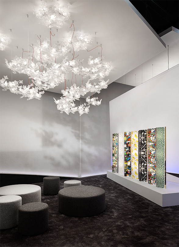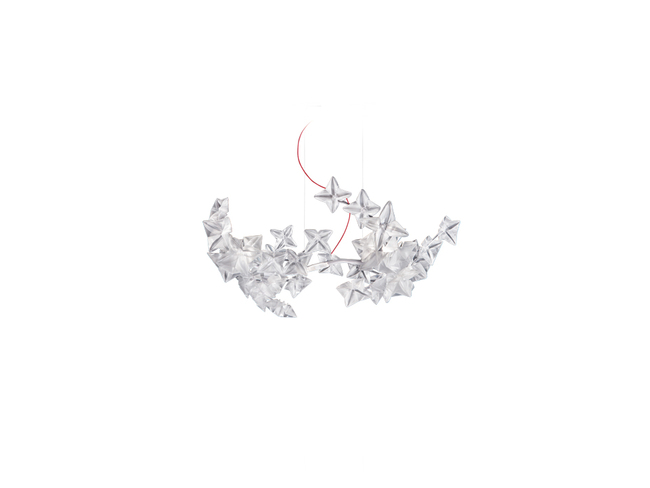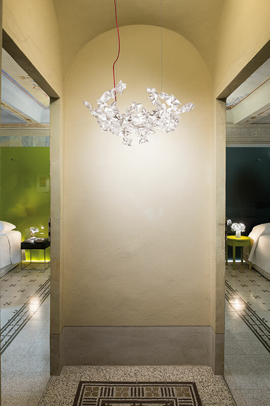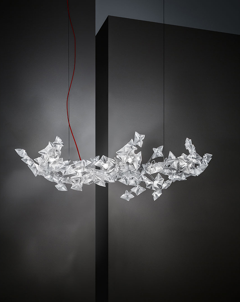 Οι μοναδικές, απαλά χρωματισμένες διαθλάσεις του Hanami κατανέμονται σε λουλούδια διπλωμένα στο χέρι από Lentiflex®, ένα πολυτελές υλικό που αναδημιουργεί ανταύγειες που μοιάζουν με διαμάντια, το καθένα τοποθετημένο σε ένα βαμμένο πλαίσιο από χάλυβα και πολυανθρακικό με σταθερούς λαμπτήρες LED G9 με δυνατότητα ρύθμισης.