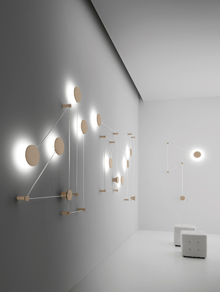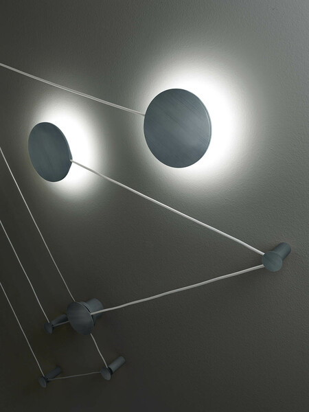 Φωτιστικό από αλουμίνιο και ανακλαστήρα ακρυλικού μεθυλεστέρα. Διαθέσιμο σε ματ λευκό, γκρι, μολυβί με λευκό καλώδιο και χρυσό με μαύρο καλώδιο. Έχει LED πηγή φωτός και έμμεσο φωτισμό.
