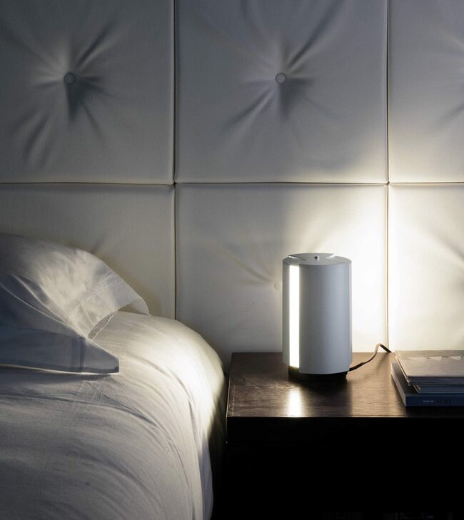 Καινοτόμος σχεδιασμός για τη δεκαετία του 50 αλλά και για σύγχρονο επιτραπέζιο φωτιστικό. To κυλινδρικό του σώμα ανοίγει σε δύο πλευρές όπου δύο ανακλαστήρες περιστρέφονται και επιτρέπουν το άνοιγμα και το κλείσιμο των ακτινών, που προσαρμόζει το φως με άμεσο και έμμεσο τρόπο. Η βάση είναι από ατσάλι σε ματ γκρι, και το σώμα από μέταλο χρωματισμένο σε λευκο, κίτρινο ή μπλε.