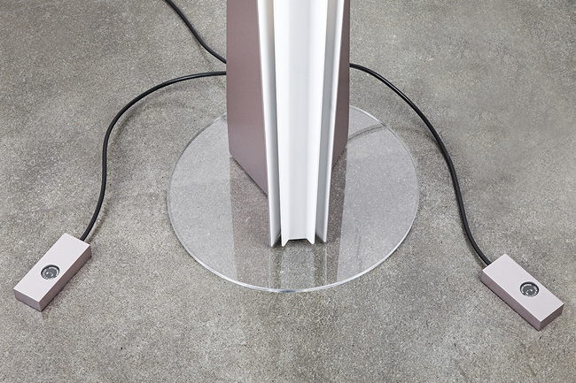 Ένα επιδαπέδιο φωτιστικό με ουσιαστικό σχεδιασμό από λυγισμένο αλουμίνιο. Οι επιφάνειές του μοιάζουν με καθρέφτη και δίνει την ατμόσφαιρα φωτισμού στη μπροστινή πλευρά και έναν αφηρημένο φωτισμό στο πίσω μέρος.