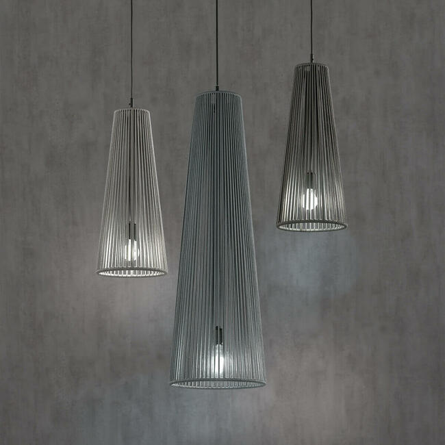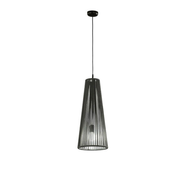 Κομψός βιώσιμος σχεδιασμός χειροποίητου πλεγμένου κορδονιού από ανακυκλωμένα πλαστικά μπουκάλια σε κωνική μεταλλική κατασκευή. H συγκεκριμένη εκδοχή έχει εγκατάσταση για λαμπτήρα E27.