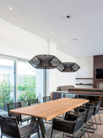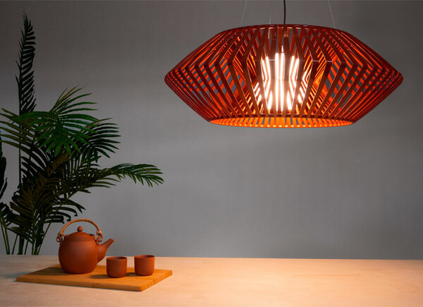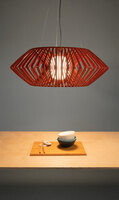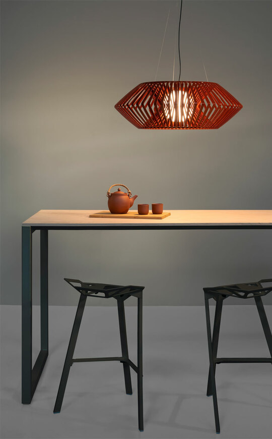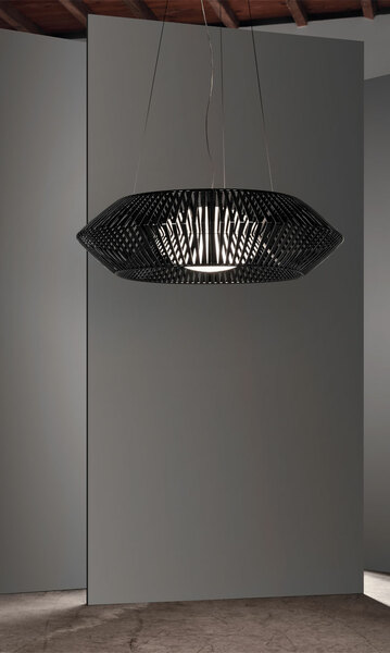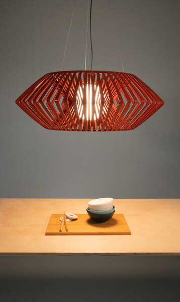 Tο φωτιστικό είναι σχεδιασμένο από τον Héctor Serrano. Μια διαστημική μορφή που μας εξιτάρει και με την οποία ταυτιζόμαστε, μέσω του ασυνήθιστου και του φανταστικού. Χάρη στην τεχνολογία της έγχυσης πλαστικού δημιουργείται μια οικογένεια φωτιστικών, η οποία μέσω του γεωμετρικού συνδυασμού των λωρίδων, μας παρασύρει σε έναν ονειρικό κόσμο. Το κρεμαστό φωτιστικό V large είναι χειροποίητο.