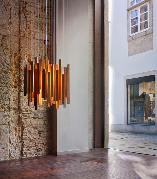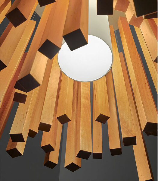 Σχεδιασμένο από τον Héctor Serrano, αυτό το κρεμαστό φωτιστικό κατασκευασμένο από κομμάτια ξύλου, αναπαράγει τη μαγεία του δάσους όταν το φως ρέει ανάμεσα από τα δέντρα. Μια αρμονική ομάδα κάθετων γραμμών σε διαφορετικά ύψη που δημιουργούν ένα παιχνίδι φως και σκότους. Η φυσικότητα του ξύλου παρέχει κομψότητα και θερμότητα στο φωτιστικό, που μοιάζει να περιμένει τον αέρα σε μια ήρεμη αταραξία.