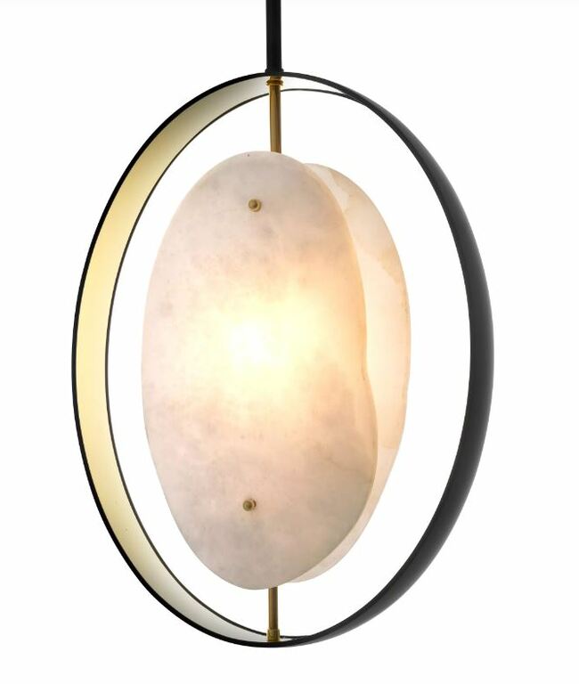Simple yet elegant in design, Chandelier Trissoni is a perfect pendant lamp for modern and industrial interiors. The gunmetal finish fixture has a ring with a gold-coloured inside to reflect the light. Two free-form plates of alabaster keep the light bulb out of sight.