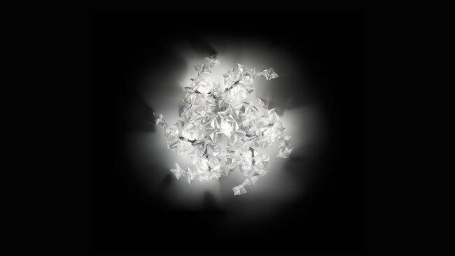 Hanami’s unique, delicately coloured refractions are distributed throughout hand-folded flowers made of Lentiflex®, a luxurious material that recreates diamond-like reflections, each mounted on a painted steel and polycarbonate frame with fixed dimmable G9 LED bulbs.