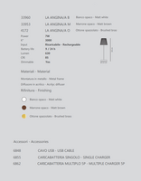 A reinterpretation of the most classic of forms, La Angina is a portable table lamp, allowing you to bring light wherever you want; and rechargeable, guaranteeing a duration of up to 9 hours. La Angina, thanks to its minimal design, fits perfectly in both classic and modern spaces; and thanks to the possibility of dimming with 3 different levels, it is possible to adjust the intensity of its light as desired. All models are equipped with a LED light source and switching on, off and dimming the light with the practical touch switch at the base.