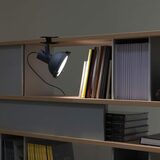 Mini adjustable version of the Projecteur 365. Available in the clamp, wall and pendant versions. Aluminium body painted in night blue, white sand or moka. Diffuser glass curved and sandblasted in the inner part. Clamp and canopies painted in matt black, screws and small black chrome metal parts. Diffused and adjustable light output. E27 socket allows the use of fluorescent and LED sources.