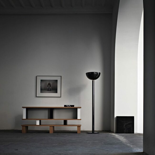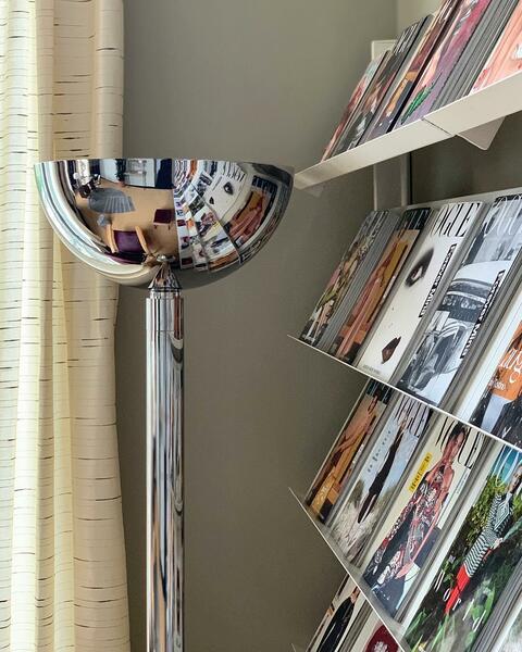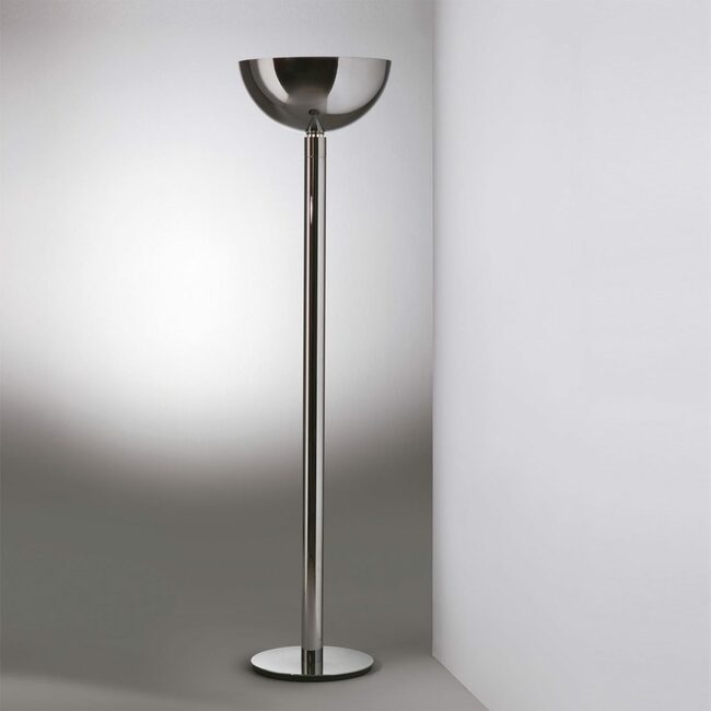 Επιδαπέδιο φωτιστικό με δομή χρωμίου. Ανακλαστήρας από οπάλ λευκό γυαλί. Η ροή του φωτός διαχέεται προς τα πάνω. Διαθέτει ντίμερ στο καλώδιο.