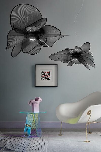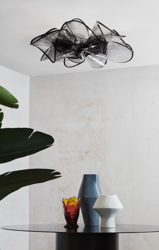 Η κομψή και αισθησιακή κίνηση είναι μέρος της οπτικής γραμματικής του La Belle Étoile. H ανάρτηση είναι εμπνευσμένη από το χαριτωμένο στροβιλισμό μιας μπαλαρίνας. Το ελαφρύ αλλά άθραυστο φωτιστικό είναι εξ ολοκλήρου χειροποίητο. Ο διάλογος μεταξύ της τεχνολογικής καινοτομίας και της στιλιστικής πρωτοτυπίας μιλάει δυνατά. H πηγή LED μπορεί εύκολα και γρήγορα να αλλάξει χάρη στο αποκλειστικό μαγνητικό σύστημα ανάρτησης και η λευκή υφή τυπωμένη σε διαφανή πολυμερή, είναι στοιχεία που συνδυάζονται για να δημιουργήσουν ένα εκλεπτυσμένο, σύγχρονο σχέδιο. Αυτό το μοντέρνο φωτιστικό διατίθεται σε δύο μεγέθη και χρώματα, μαύρο ή λευκό, ανάλογα με τον τύπο του χώρου. Και οι δύο εκδόσεις είναι ευέλικτες, πρωτοποριακές λύσεις φωτισμού που προσφέρουν μια minimal, λαμπερή αισθητική. Το La Belle Étoile φέρνει γλυπτικό φωτισμό σε μια σειρά εσωτερικών χώρων, με την ένταση φωτισμού να κυμαίνεται από 0 έως 100 για να ταιριάζει στα γούστα όσων το επέλεξαν.