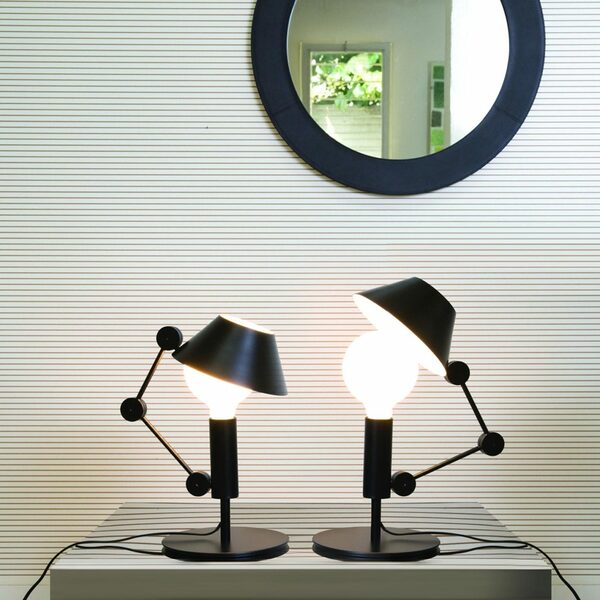 Γραφικό και παιχνιδιάρικο επιδαπέδιο φωτιστικό κατασκευασμένο με αρθρωτό βραχίωνα και σώμα σε ματ μαύρο μέταλο. Το εσωτερικό του είναι σε ματ λευκό χρώμα που δημιουργεί ένα φως που διαχέεται και δύνεται η δυνατότητα να μειωθεί η ένταση του φωτός στο πάνω μέρος χάρη στο κάλυμα του φωτιστικού.