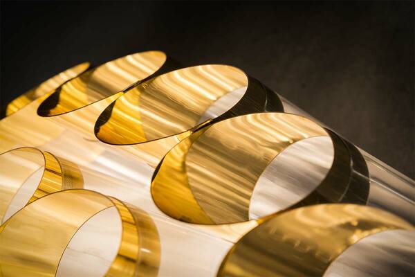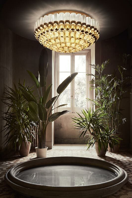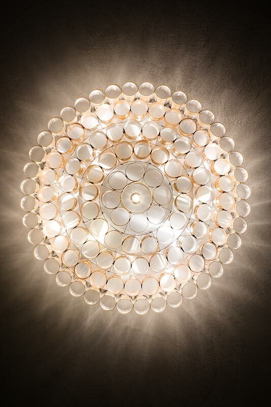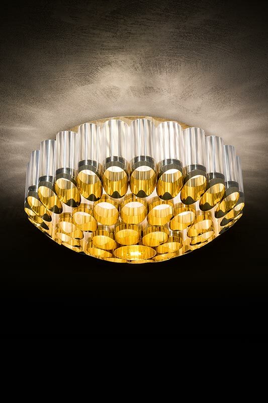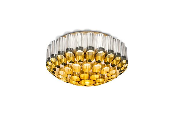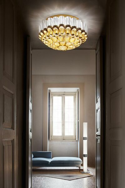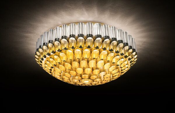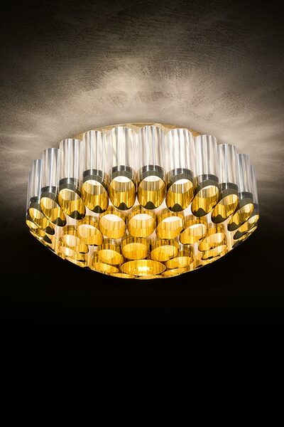 Αυτό το εντυπωσιακό φωτιστικό οροφής πήρε το όνομά του από τον ελληνικό όρο Ωδείον, ένα μέρος που προορίζεται για μουσικές παραστάσεις. Η καλλιτέχνης Lorenza Bozzoli αποτυπώνει το μεγαλείο της πολυτελούς αρχιτεκτονικής του Art Deco, σε έντονη αντίθεση με το ζοφερό στυλ του μεταπολεμικού στυλ. Το Odeon αποτίει φόρο τιμής στο θέατρο, τις δραματικές τέχνες και το joie de vivre και διατίθεται σε δύο μεγέθη, με διάμετρο 65 ή 100 cm, με ομόκεντρες κορώνες από συζευγμένο μεταλλικό Goldflex και Lentiflex, ένα γυάλινο, κυματιστό τεχνοπολυμερές. Το φωτιστικό αποστέλλεται πλήρως συναρμολογημένο σε προστατευτική ξύλινη συσκευασία και τοποθετείται εύκολα. Οι λαμπτήρες μπορούν να αντικατασταθούν αυτόνομα.