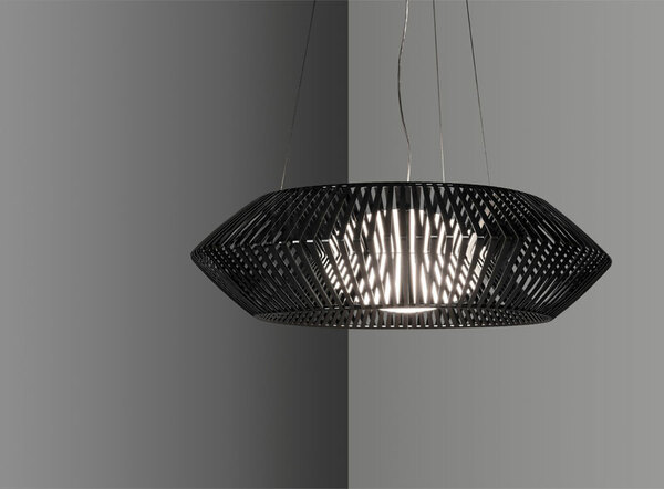 Tο φωτιστικό είναι σχεδιασμένο από τον Héctor Serrano. Μια διαστημική μορφή που μας εξιτάρει και με την οποία ταυτιζόμαστε, μέσω του ασυνήθιστου και του φανταστικού. Χάρη στην τεχνολογία της έγχυσης πλαστικού δημιουργείται μια οικογένεια φωτιστικών, η οποία μέσω του γεωμετρικού συνδυασμού των λωρίδων, μας παρασύρει σε έναν ονειρικό κόσμο. Το κρεμαστό φωτιστικό V large είναι χειροποίητο.